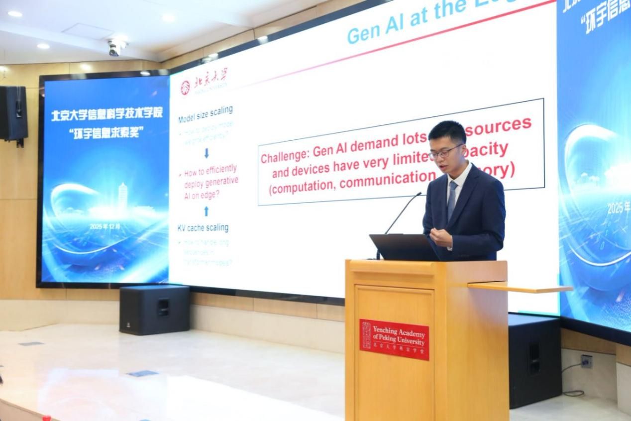 2022级应用物理学专业本科生傅子酌重点介绍了这一学年中的科研工作“面向边缘设备的高效生成式人工智能加速”。他针对生成式人工智能在边端的部署问题,进行了软硬件的协同探索。其中两项工作聚焦于解决边端模型部署问题,以应对模型大小持续增长的挑战,另外两项工作聚焦于KV cache的优化问题,以满足长序列生成任务的需求。