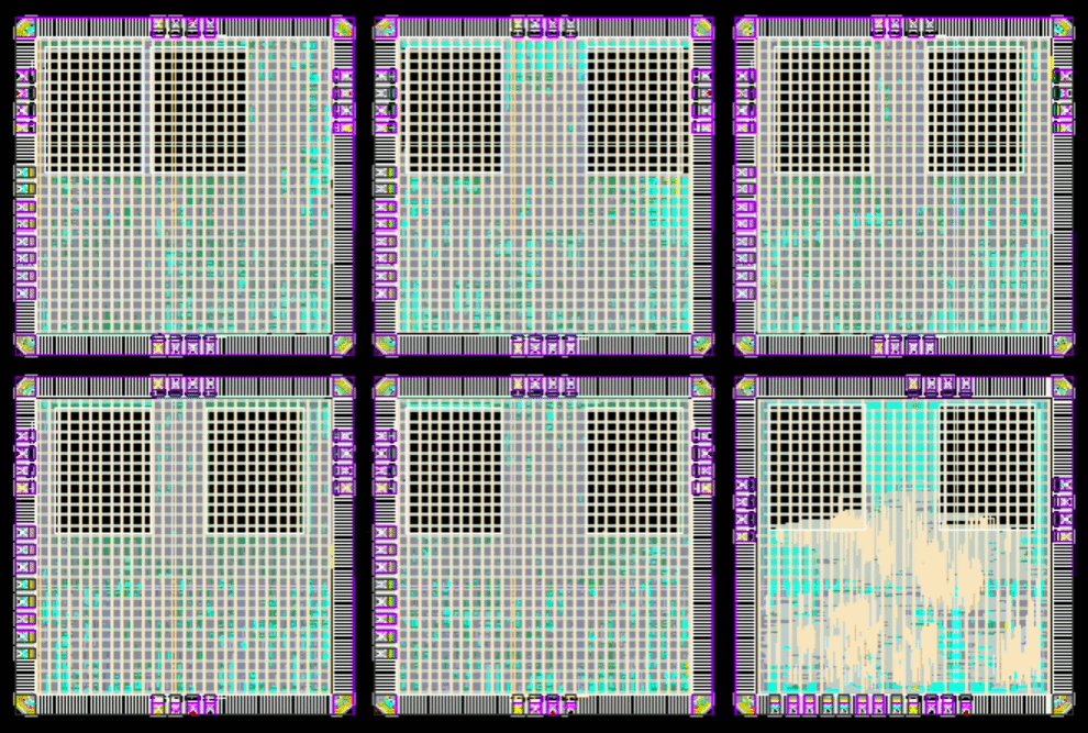 电芯片班的设计题目为端侧AI SoC芯片,六组学生在给定RISC-V CPU与总线框架的基础上,自主完成了NPU(神经网络处理单元)的设计,实现了面向卷积神经网络推理任务的硬件加速,并完成了从电路设计到物理版图的全流程实践。不同小组围绕系统瓶颈与数据流组织采取了差异化策略:有的小组自主编写DMA接口,实现NPU与片上存储之间的直接数据获取;有的通过数据复用、FIFO缓冲等结构优化访存开销与吞吐效率。各组也对自身设计的PPA(性能、功耗、面积)指标进行了评估,展现出不同权衡下的实现效果。最后,部分小组还在版图可用区域进行了标识设计,绘制了信班Logo与名称,实现了设计署名与可视化呈现,为项目增添了几分趣味。